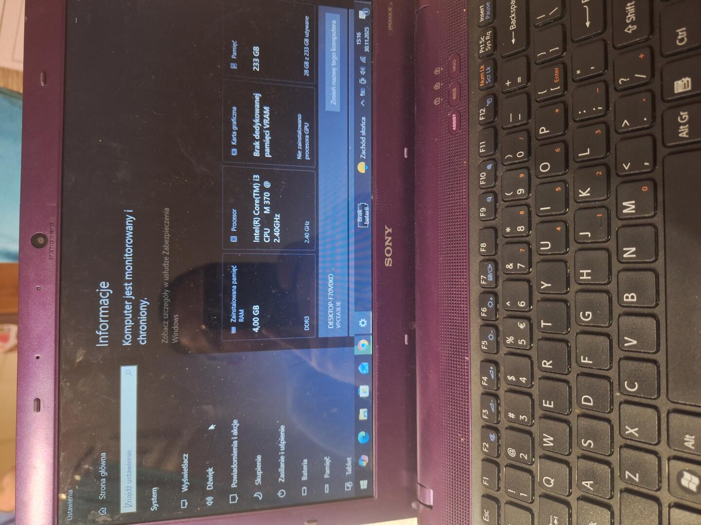 Laptop nie posiada Bateri po za tym sprawny dziala.